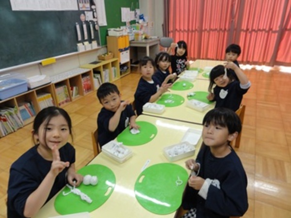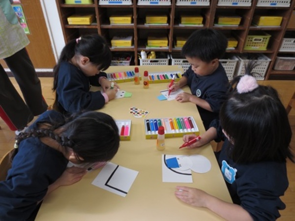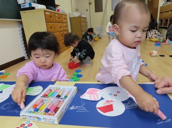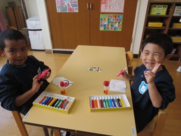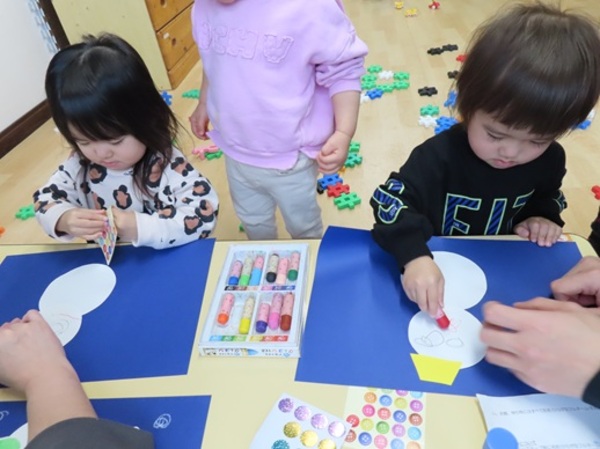 クレヨンで目などでのパーツを描いたり、手形を手袋に見立て製作しています!