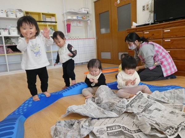 おさんぽでは、道行く人に手を振ってあいさつをしていました!新聞をくしゃくしゃにすると音が鳴ることを楽しんでいました!